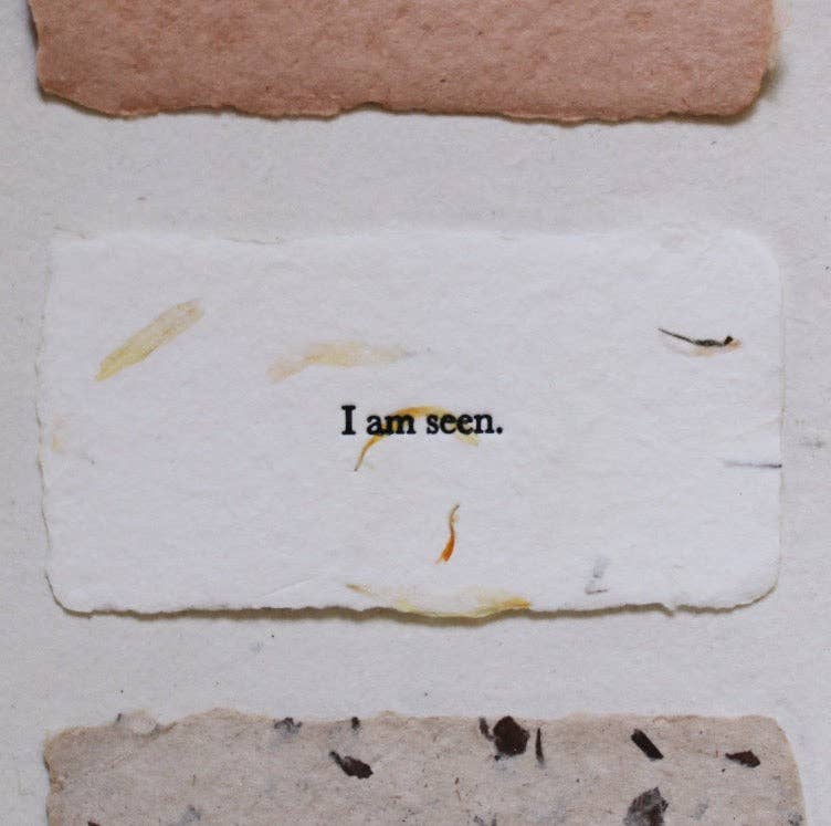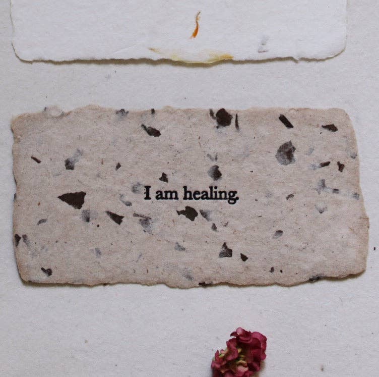 Top to bottom: “I belong.” on terra cotta, “I am seen." on petal , “I am healing.” on tea leaf