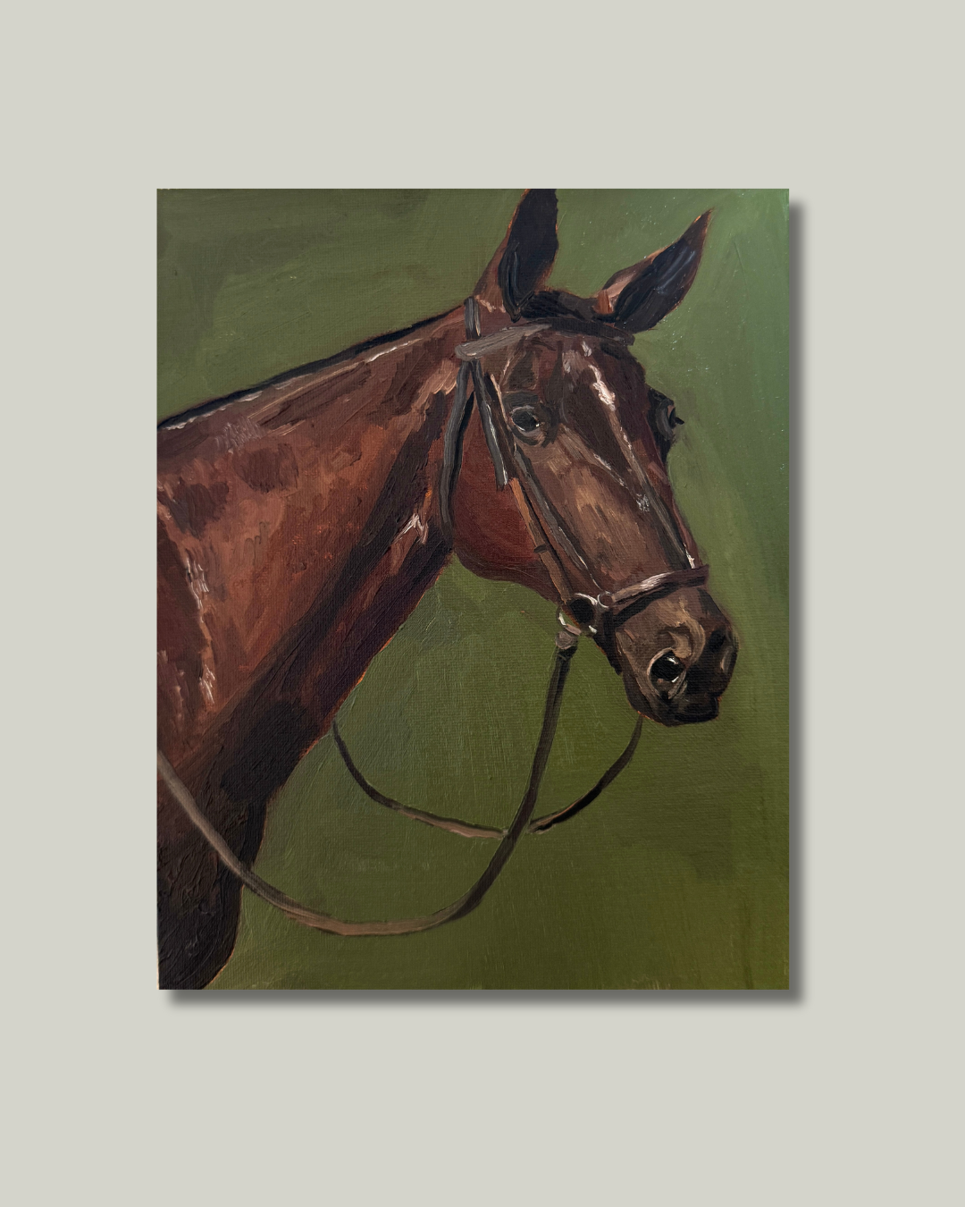 Arizona is a portrait of a classic racehorse, captured with strong, simple brushwork and a rich, earthy palette. The deep brown coat and leather reins stand out against a moody green background, creating a grounded, timeless feel.
