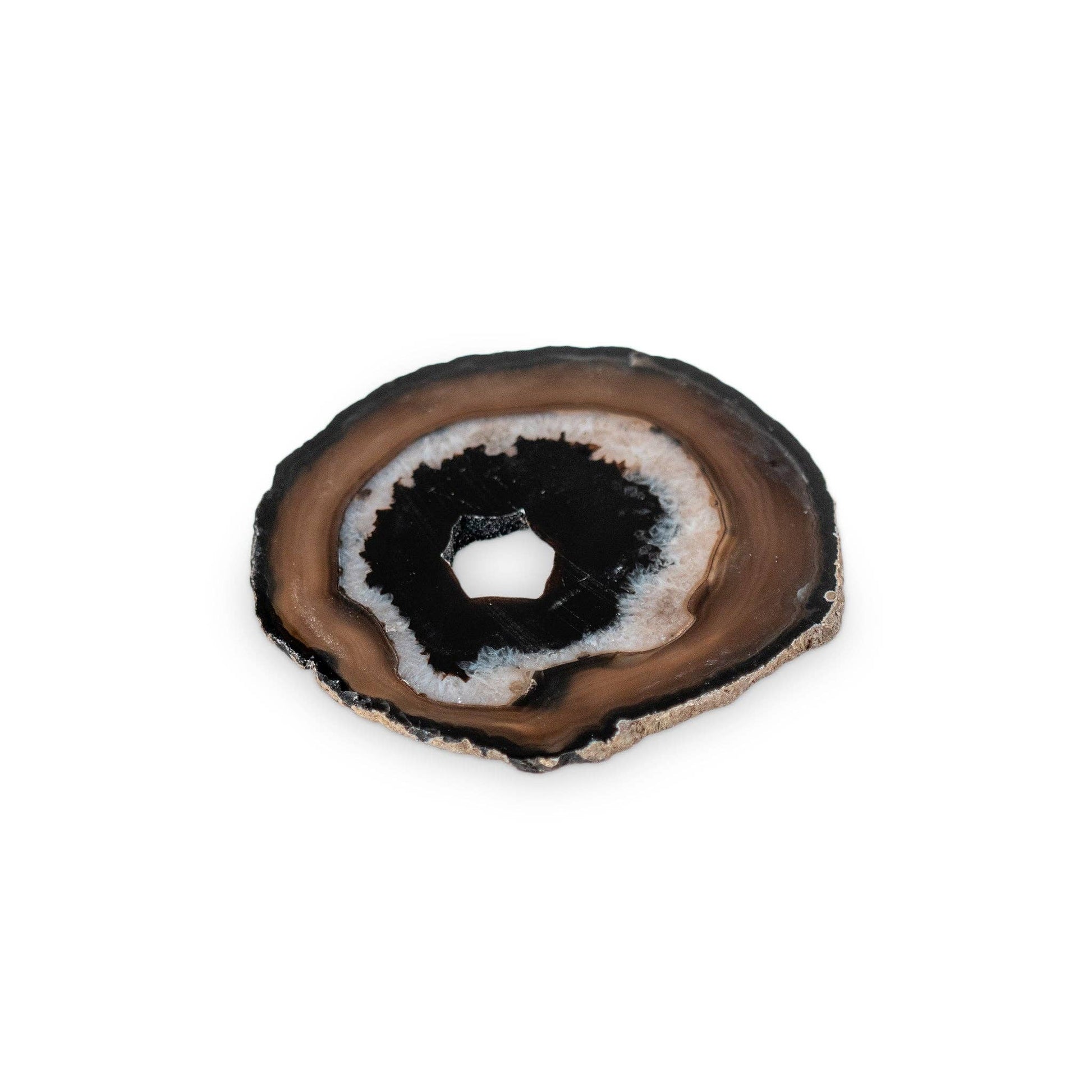 Black agate coaster These agates are created from brazilian geode thinly sliced to reveal a brilliant crystalline pattern. Traditionally revered for their metaphysical properties, no two brazilian agates will ever look the same. Measuring approximately in diameter, our agate makes an excellent coaster or the perfect holder for all of our candles and luminaries. *agates will not exactly match with the picture shown as they are a natural formation and each one is unique