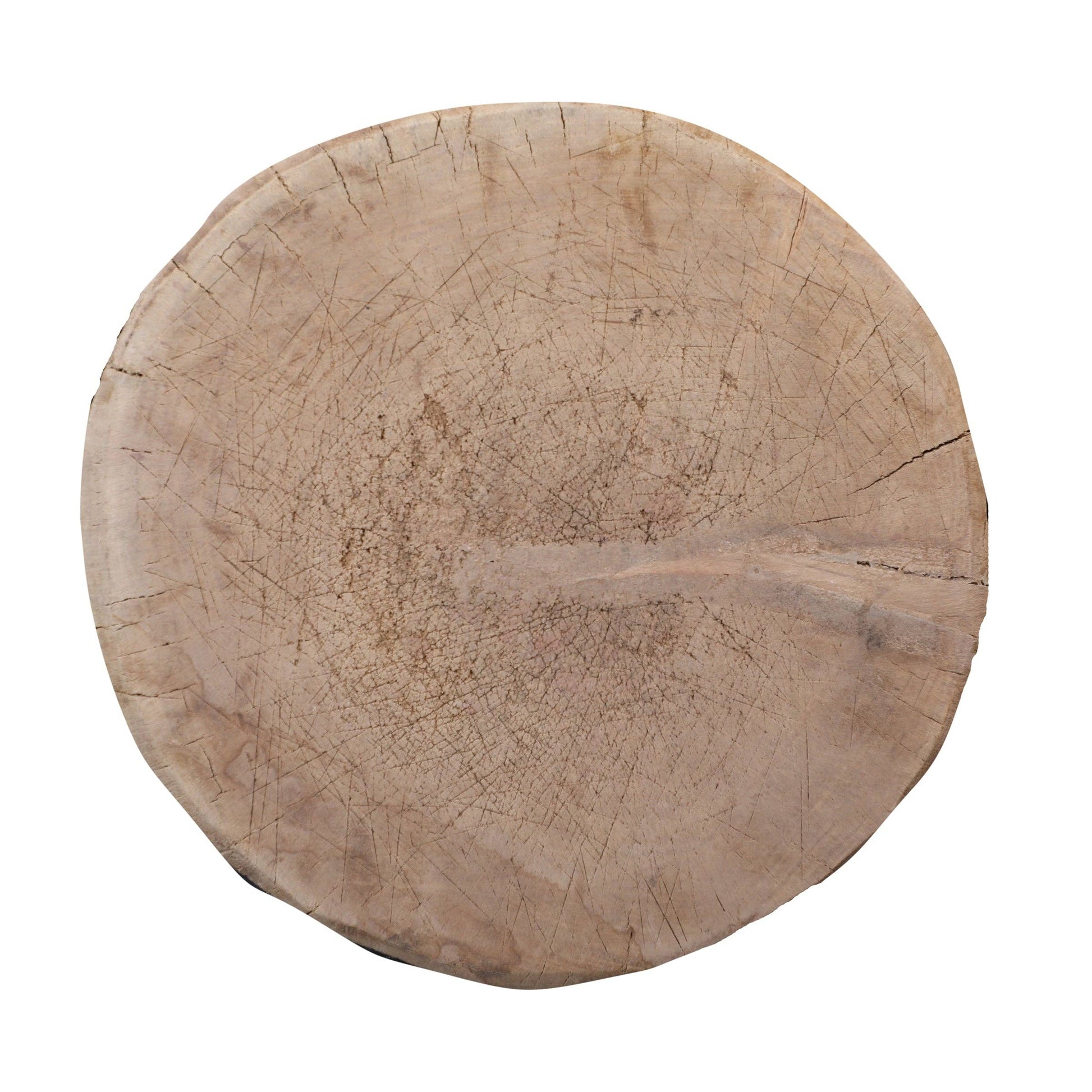 The Chapati Board is a long-standing household necessity in homes across India. These vintage Bleached Chapati Boards take a modern turn as a home accent. These round wood slabs with small legs make a sturdy farmhouse display stand for candles or a collection of succulents. These are for display only. This is a vintage item. Condition, shape, size, and color will vary.