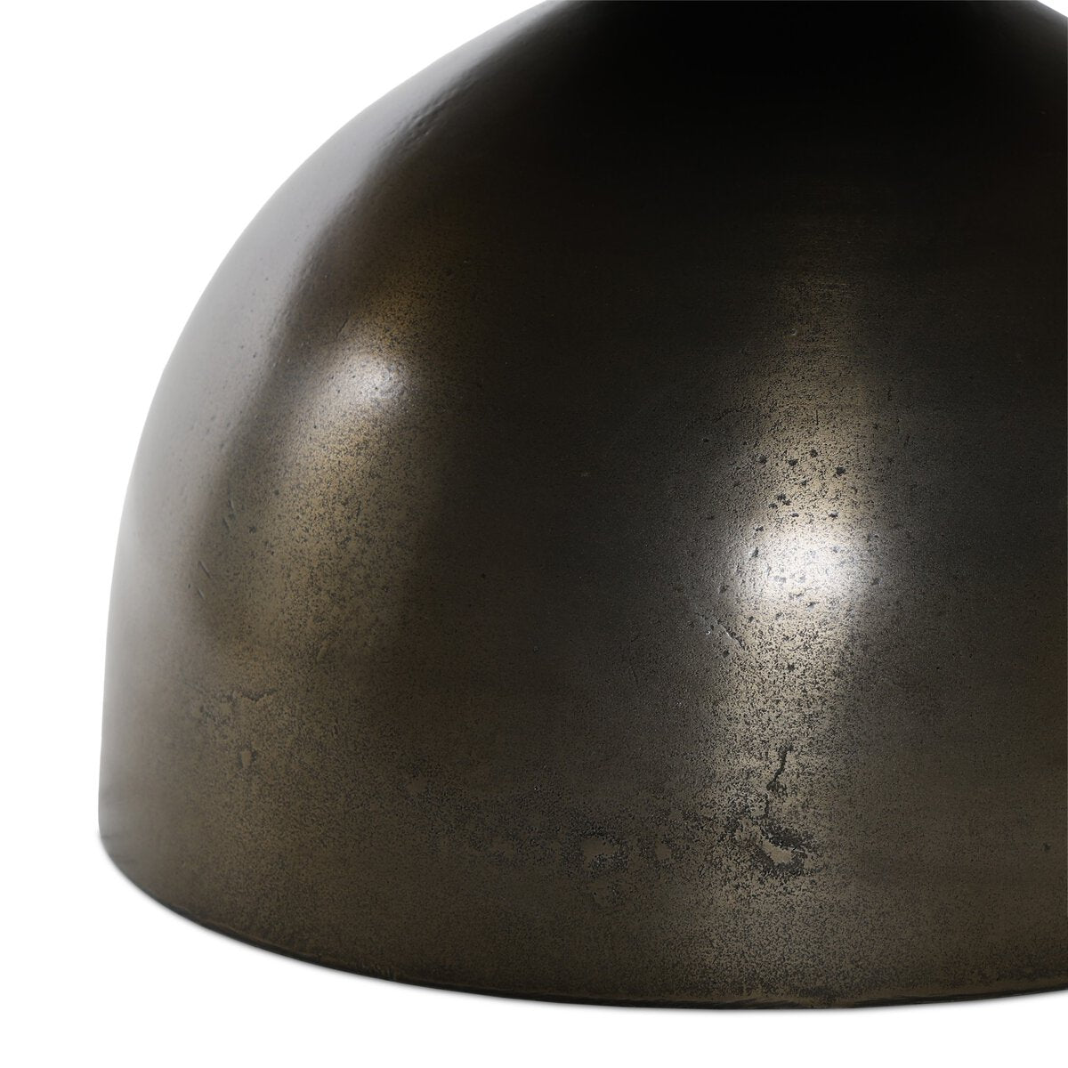 For a sculptural play on shape, a bronze metal base supports a rounded tabletop of taupe solid marble with swirls of natural veining.