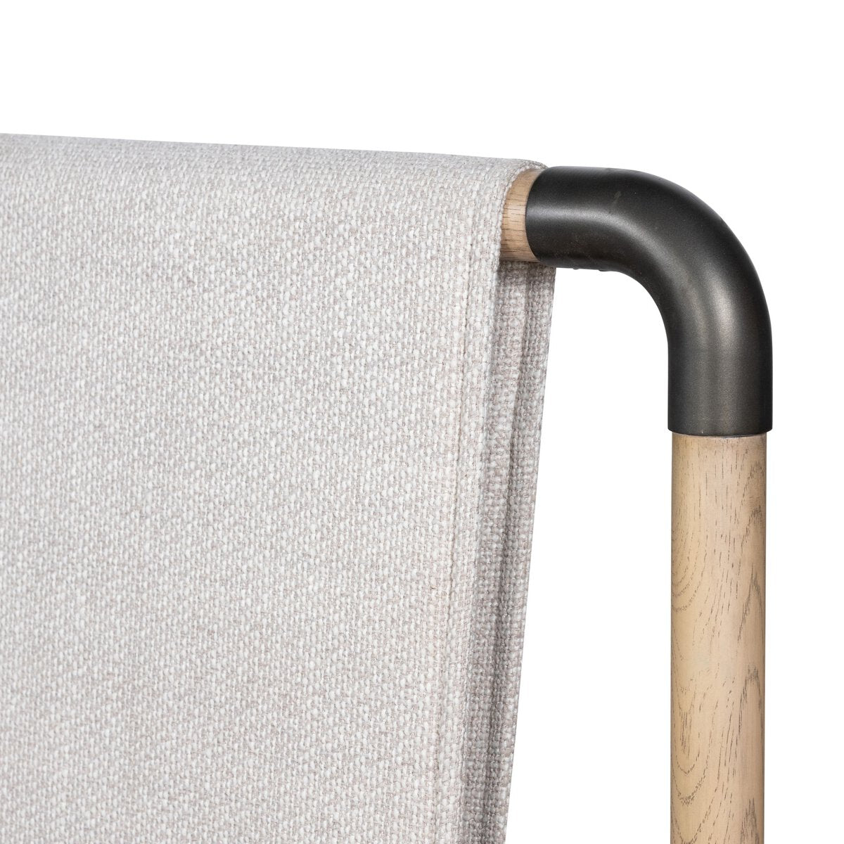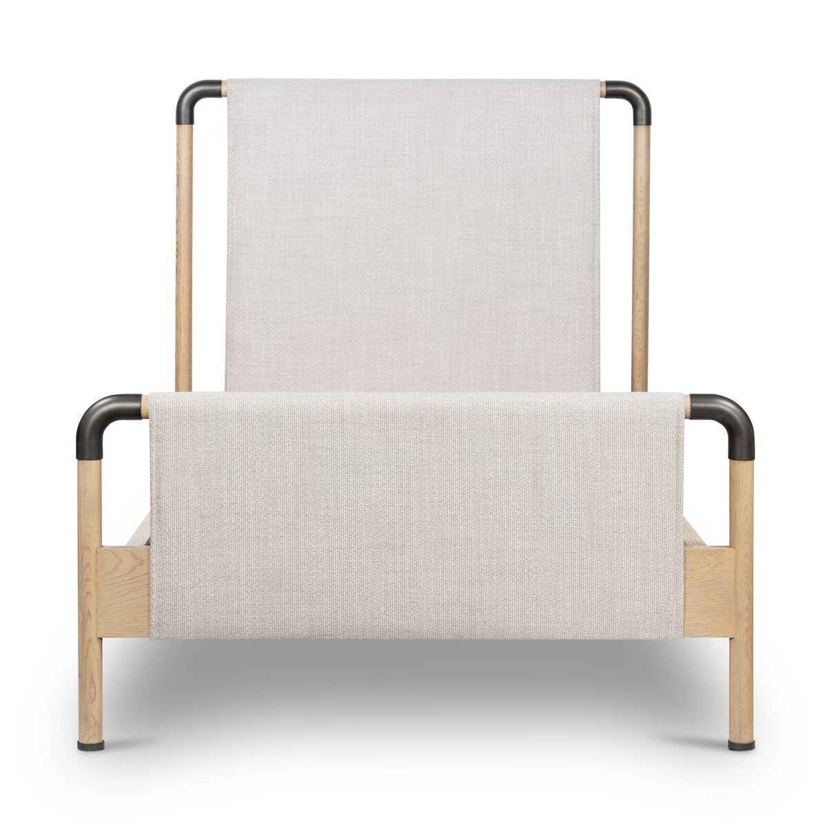 Mixed materials make the bed. Framed by solid oak with rounded iron corners, a sling-style headboard upholstered in high-performance fabric brings a light, modern vibe to the bedroom. Great solo or in pairs.