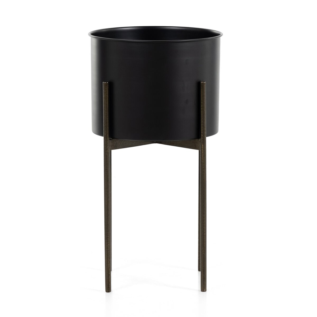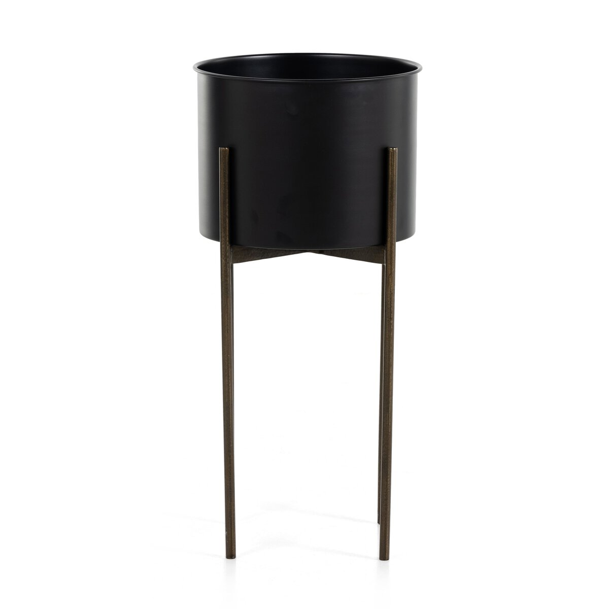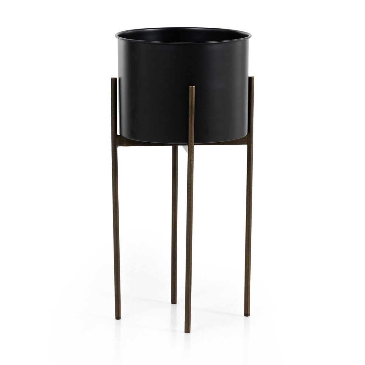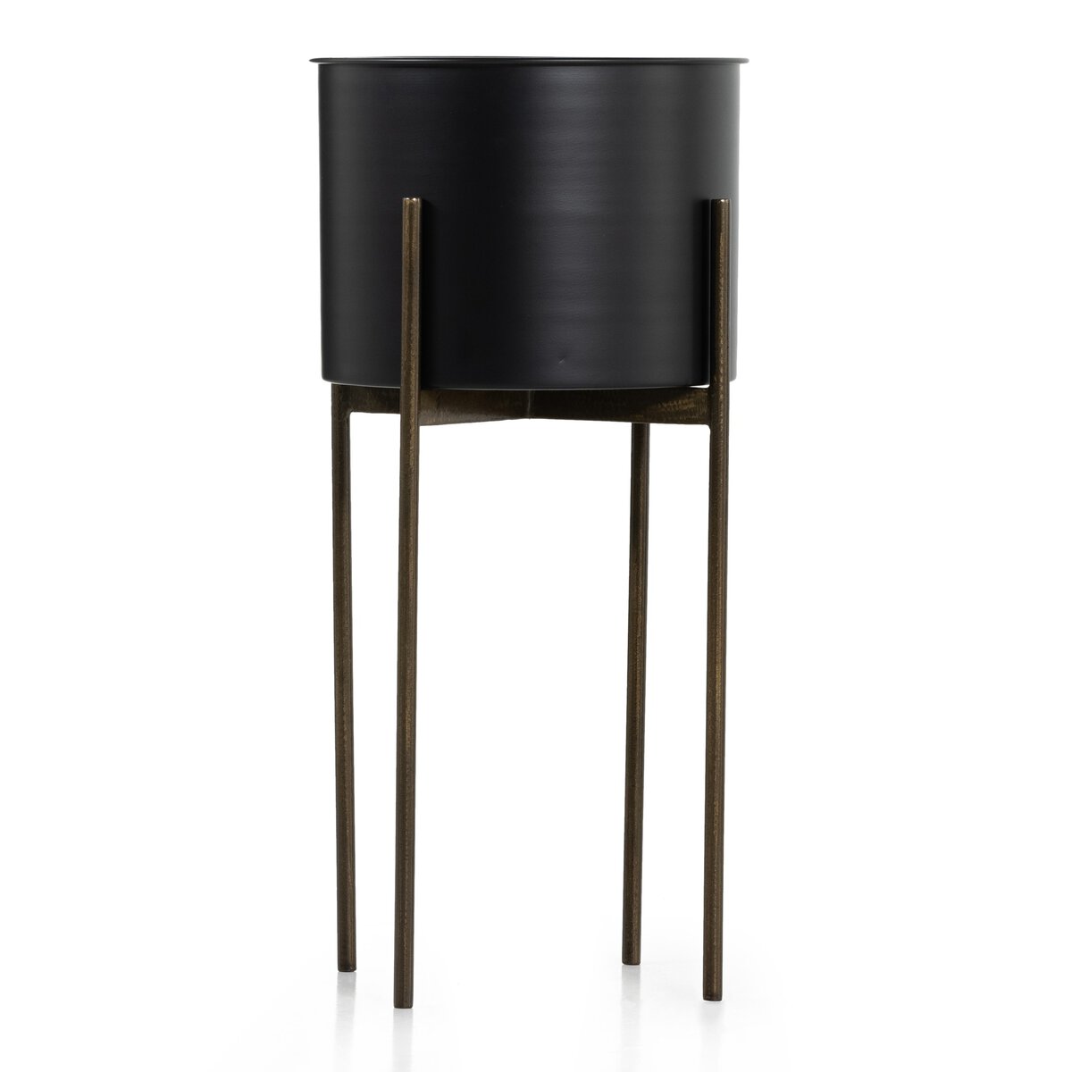 Slim legs of dark brass-finished iron support an inset planter of rounded iron in matte black. Plastic plant liner recommended (not included). Cover or store indoors during inclement weather and when not in use.