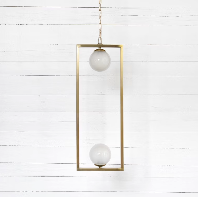 Antique brass-finished steel forms an open triangle, securing dual frosted glass bulb shades. Throw a new light on minimalist style. Modern, mid-century-inspired fixtures are clean and understated. Made from solid brass and stainless steel with rich brass, pewter and oil-rubbed bronze finishes. Layered, coiled shaping creates repetition and movement. The shaped light and shadows they cast add depth and intrigue to any space.