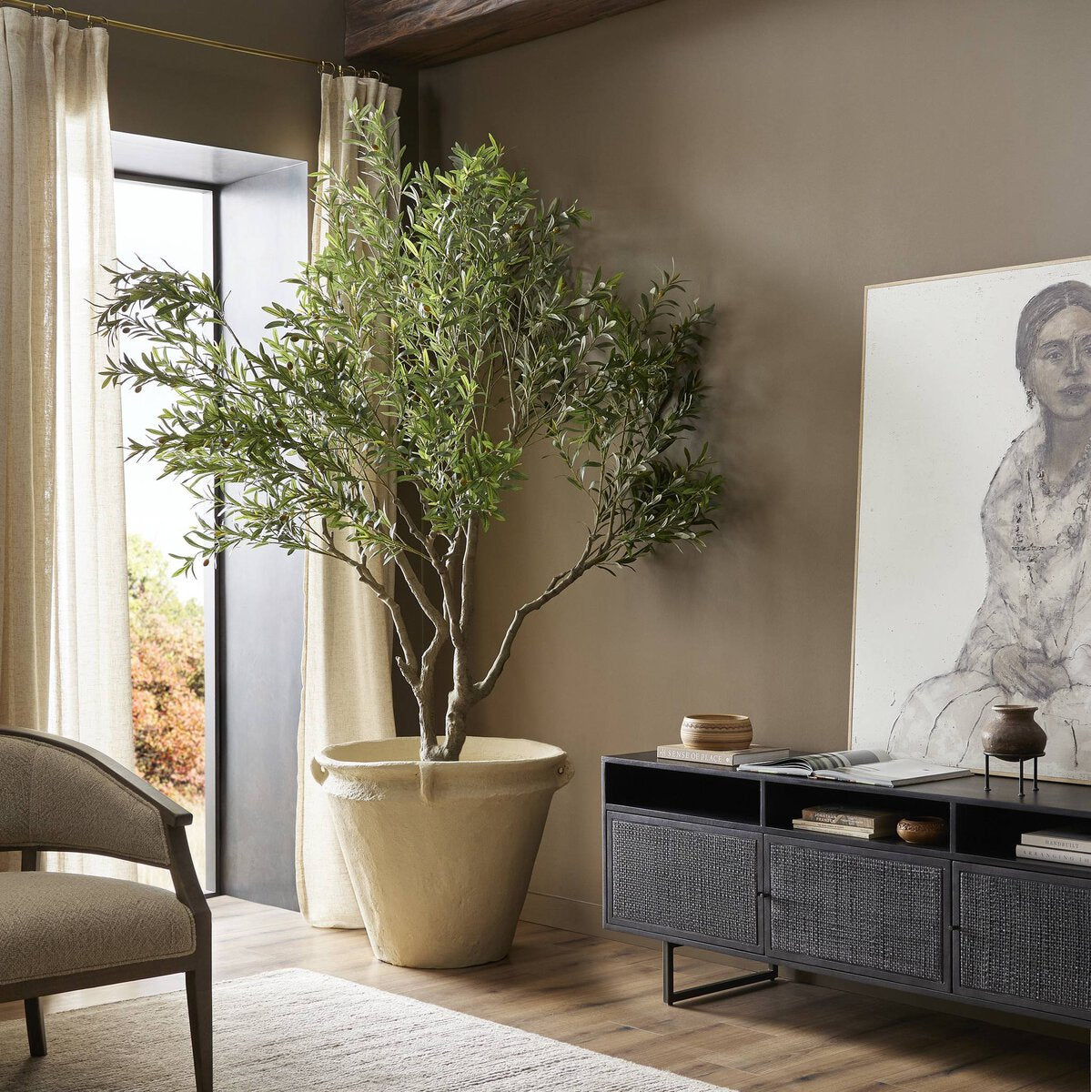 A bold vessel for faux indoor plants or storage for throw blankets, finished with small archaic handle details around a rolled lip. Handcrafted from paper mache, each piece will vary slightly in texture, color and shape. Holds up to 150 pounds. Not water-tight; for decorative use only. A design collaboration by Amber Lewis and Four Hands.