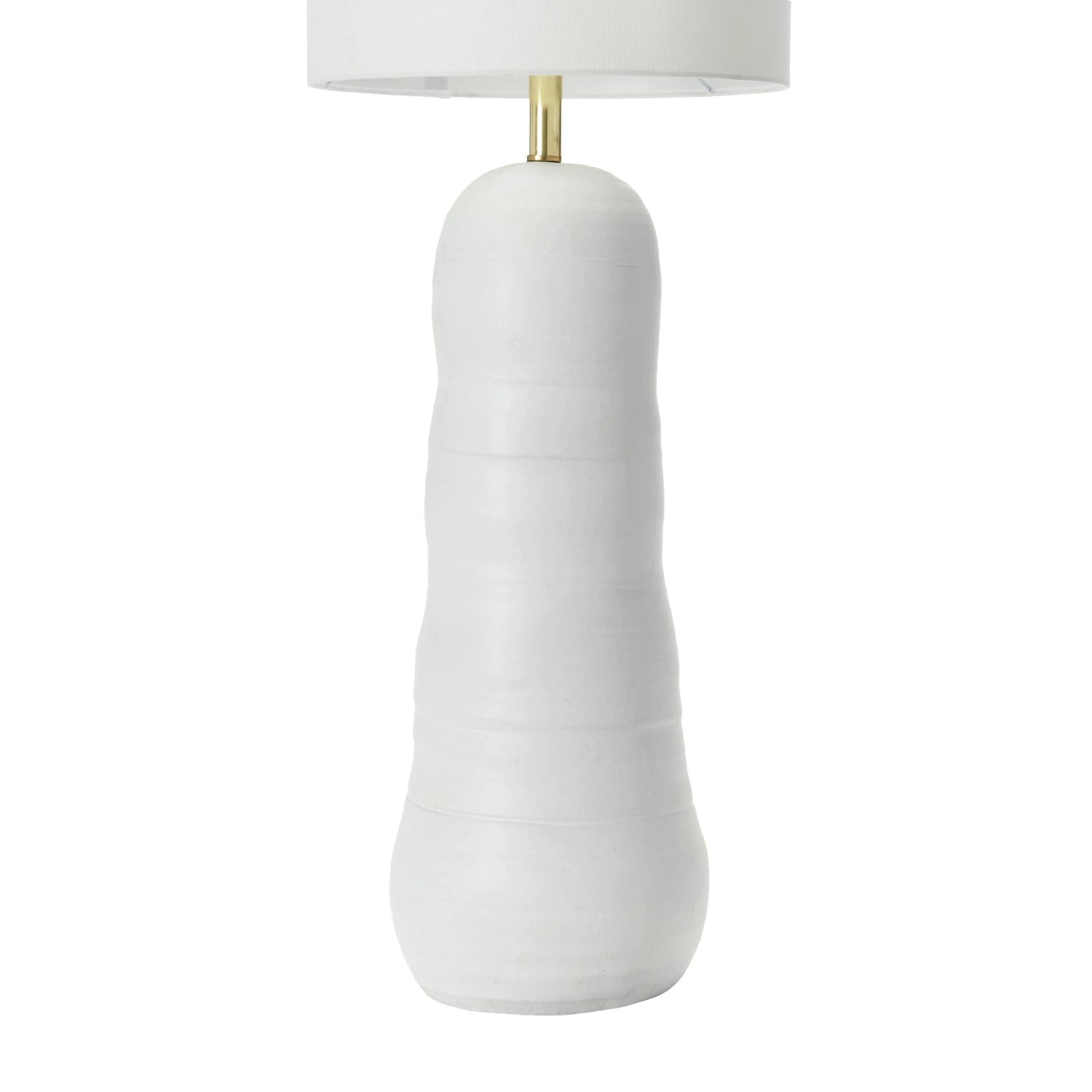 Add some style and personality to the space with this matte white stoneware floor lamp that showcases a matte white stoneware base with a naturally variating reactive glaze, topped with an oversized white linen cylindrical shade.