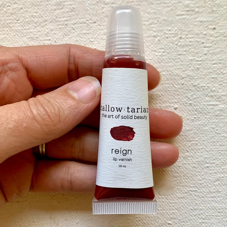 Like a wood varnish, when our lip varnish absorbs into your lips, it seals in deluxe hydration + color.