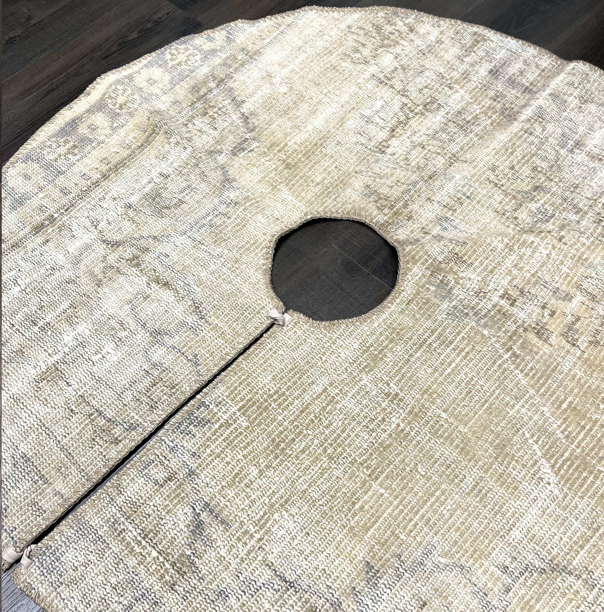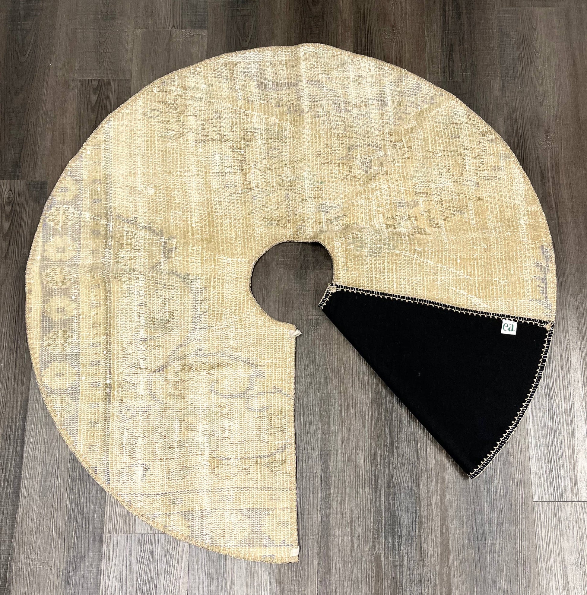 Classic round 4' wide tree skirt with beige ties to securely fasten in place. Hand-knotted, vegetable, and plant-dyed wool with a black canvas cotton backing. Age-related wear and patina are considered normal in these unique rugs. Some items may not be perfectly centered since these pieces are handmade. We consider these characteristics as part of what makes them one-of-a-kind.
